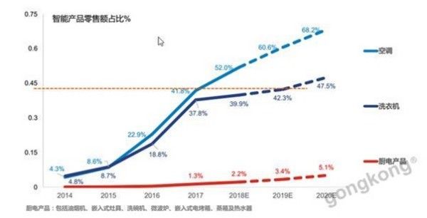 从以上数据可以看出,中国的智能家居市场是全球智能家居市场增长重心。而作为智能家居行业的上游产业,芯片、模块、元器件、控制器、(云服务、数据、语音、安全、操作系统)解决方案商,以及智能设备制造商则需要特别关注这一行业。下面,工控小编从智能家电、家庭安防和智能照明三个方面进行论述。